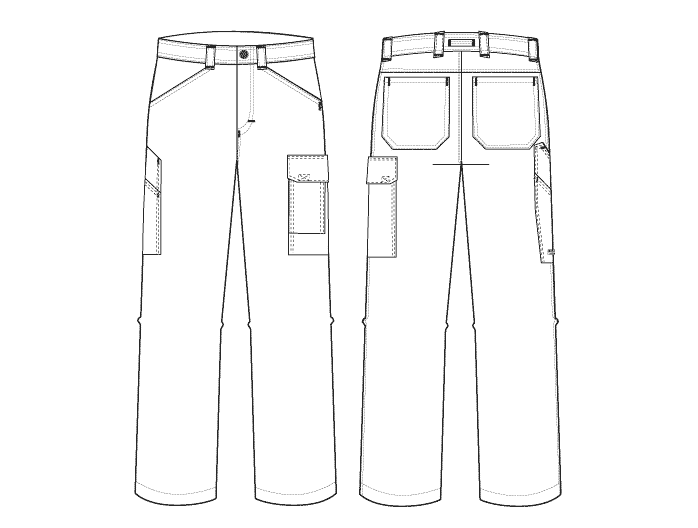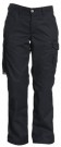 Enkel dambyxa med plastknapp i midjan. Rymliga sidfickor. Bakfickor. Tumstocksficka med verktygsficka. Benficka med ficklock, telefonficka och D-ring.