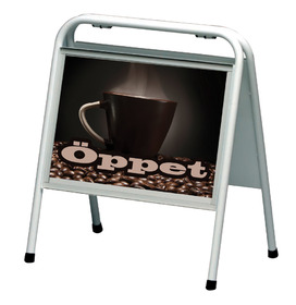 Detta skyltställ lämpar sig väl i lite trängre utrymmen. Många mäklare och frisörer använder sig av detta skyltställ. Finns i färgerna vit och svart.